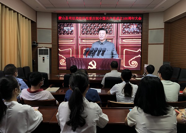 7月1日,蒙山县司法局组织集中观看庆祝中国共产党成立100周年大会,聆听学习习近平总书记的重要讲话。