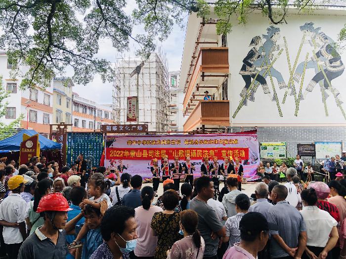 8月30日,正值夏宜瑶族乡的盘王节,十里八乡的村民、游客、摄影爱好者汇聚一堂,欢庆瑶族特别的节日。蒙山县司法局借助此次机会,组织开展“山歌唱诵民法典”宣传活动,为广大少数民族群众送去一场“接地气”的法治文化大餐。