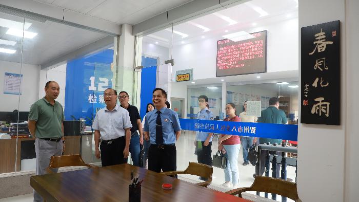 在八步区检察院,韦焕成一行先后参观了该院12309检察服务中心、青少年人文教育馆、清廉文化长廊、数字检察办公室、公益诉讼快速检测实验室、党员先锋站、融媒体中心等。随行人员边参观边详细了解该院的相关情况。