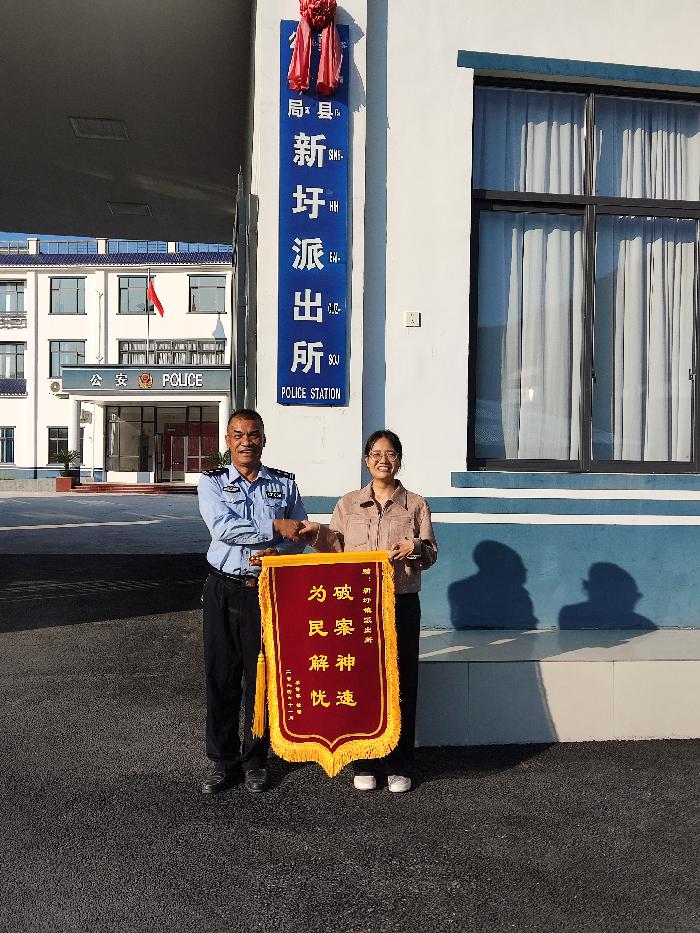 11月18日上午,新圩镇新圩派出所收到黎女士送来的一面撰有“破案神速 为民解忧”的锦旗,感谢新圩派出所民警在5个小时内火速帮助其寻回手机。