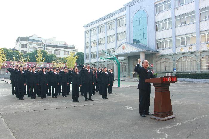 12月4日上午,在蒙山县人民检察院机关大院里,党组书记、检察长韦焕成左手抚按宪法,右手举拳,面向五星红旗领诵誓词,全体干警整齐排列、右手握拳,集体重温宪法宣誓誓词,以掷地有力的声音诠释着为大局服务、为人民司法、为法治担当的决心和信心。