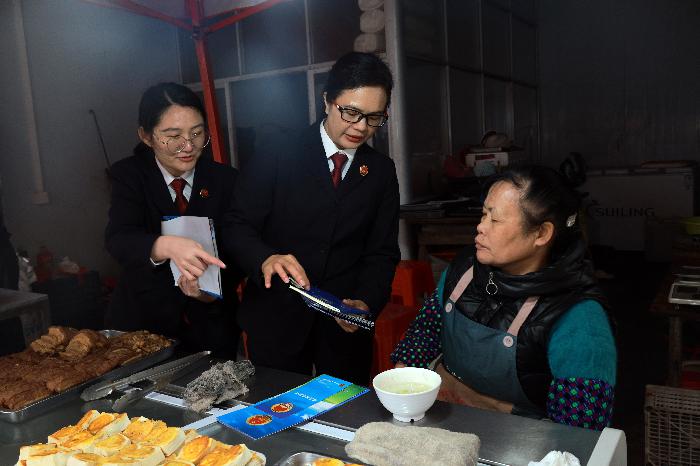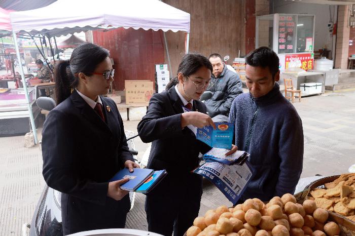 12月6日上午,在新圩镇集贸市场,蒙山县人民检察院“红石榴”检察服务队队员向过往群众发放着相关宣传材料,并以身边的典型案例向驻足的群众进行着普法宣传及案件线索的征集。