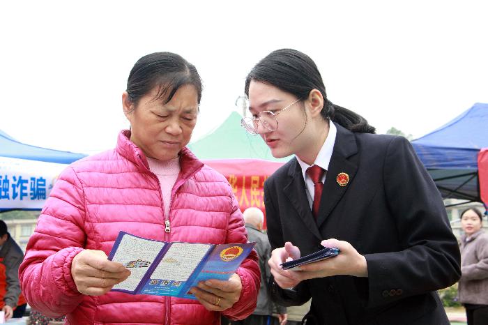 12月6日上午,在主持人报幕后,蒙山县人民检察院“红石榴”检察服务队队员走上蒙山县新圩镇新圩村大戏台,以情景剧的形式,绘声绘色地给台下群众普及起反诈知识来。