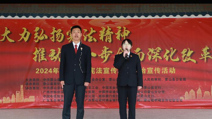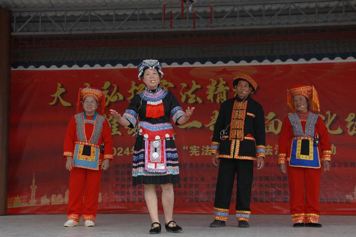 12月6日上午,在蒙山县人民检察院联合县司法局、公安局、新圩镇政府等部门举办的文艺汇演活动上,蒙山山歌班用广西非物质文化遗产--蒙山山歌唱响对宪法的礼赞,清澈嘹亮的蒙山山歌回荡在新圩镇新圩村的上空,给辖区群众带来听觉上的震撼。