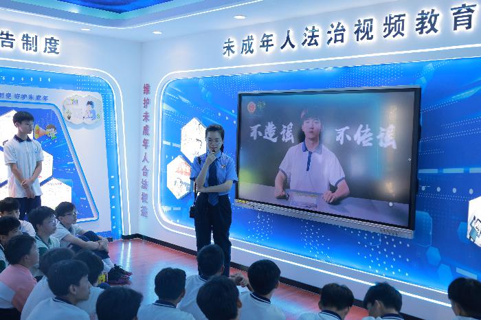 “同学们,接下来我们观看一个剧本杀小视频,大家认真看完视频以后要告诉老师你们学到了什么......”在法治教育展厅内,同学们观看了法治教育视频,真实改编的案例展示、生动的图文解说、详细的法律知识讲解让同学们进一步认识网络欺凌的表现形式、危害后果,直观的了解到未成年人容易触犯的“法律红线”,警醒同学们要时刻规范自身行为。