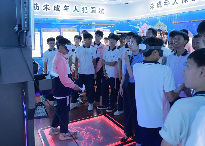在教育基地内,同学们通过体验VR虚拟现实技术模拟的防性侵、防欺凌、校园放火等特定场景,在虚拟环境中学习到如何运用法律武器保护自己,提升未成年人的自护技能。