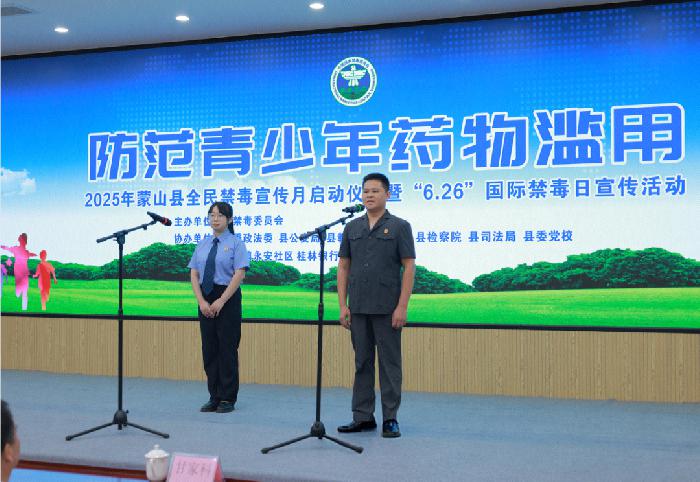 扫除毒害,利国利民。2025年6月,蒙山县人民检察院在“全民禁毒宣传月”期间,严格贯彻落实“谁执法谁普法”责任制要求,用通俗易懂、极具地方特色的普法方式走进机关、学校、社区等,为营造全社会共同参与禁毒、人人拒毒氛围贡献了检察力量。下一步,蒙山县人民检察院将立足主责主业,充分发挥法律监督职能,严厉打击毒品犯罪,不断创新禁毒宣传方式,通过更“接地气”、更“走心”方式传播禁毒声音,以法治之力筑牢禁毒安全防线。