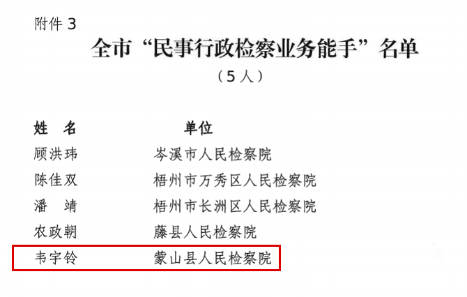 韦宇铃同志在梧州市检察机关2025年民事行政检察岗位练兵、业务竞赛活动中获评“民事行政检察业务能手”。
