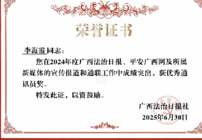 李海霞同志在宣传报道和通联工作中成绩突出,被广西法治日报社评为2024年度优秀通讯员。